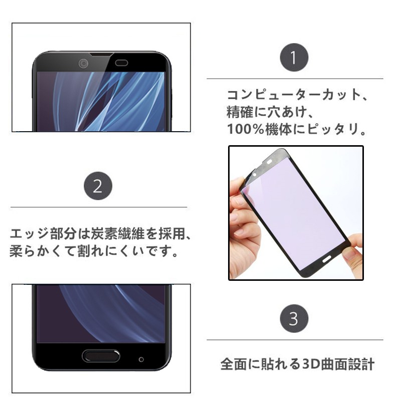 簡単説明: 【製品仕様】 ■材質:高品質ガラス採用(日本メーカー) ■硬度:9H ■厚み:約0.3mm ■商品内容: 1、強化ガラス製保護フィルム 2、ダスキン掃除用布   3、アルコール用布 4、スクリ・強化ガラスフィルム+炭素繊維フレーム 炭素繊維の3D曲面加工』画面全体を保護する! ・フレーム部分は「軽くて、強く、腐食しない」最先端技術の3Dラウンドエッジ加工により、 曲面の完全カバーを実現。割れにくいだけではなく、丈夫で変形しにくいです。 ・液晶画面に当たる部分は硬度9H強化ガラスフィルムで外部の衝撃からしっかり守ってくれます。 ・硬度9H強化ガラスフィルムと炭素繊維層の組み合わせ、保護機能を更に強化します。 ・0.2mmの極薄フィルム、表面硬度9Hで、カッターなどの鋭利なものを当てたとしても損傷なく使用可能。 ■商品内容: 1、炭素繊維フレーム一体型強化ガラス1枚 2、ダスキン掃除用布   3、アルコール用布 4、スクリーン掃除用シール 5、日本語マニュアル 6、スクラッチカード ■対応機種:AQUOS Sense Plus SH-M07 、 Android One X4 ■カラー: ホワイト、ブラック